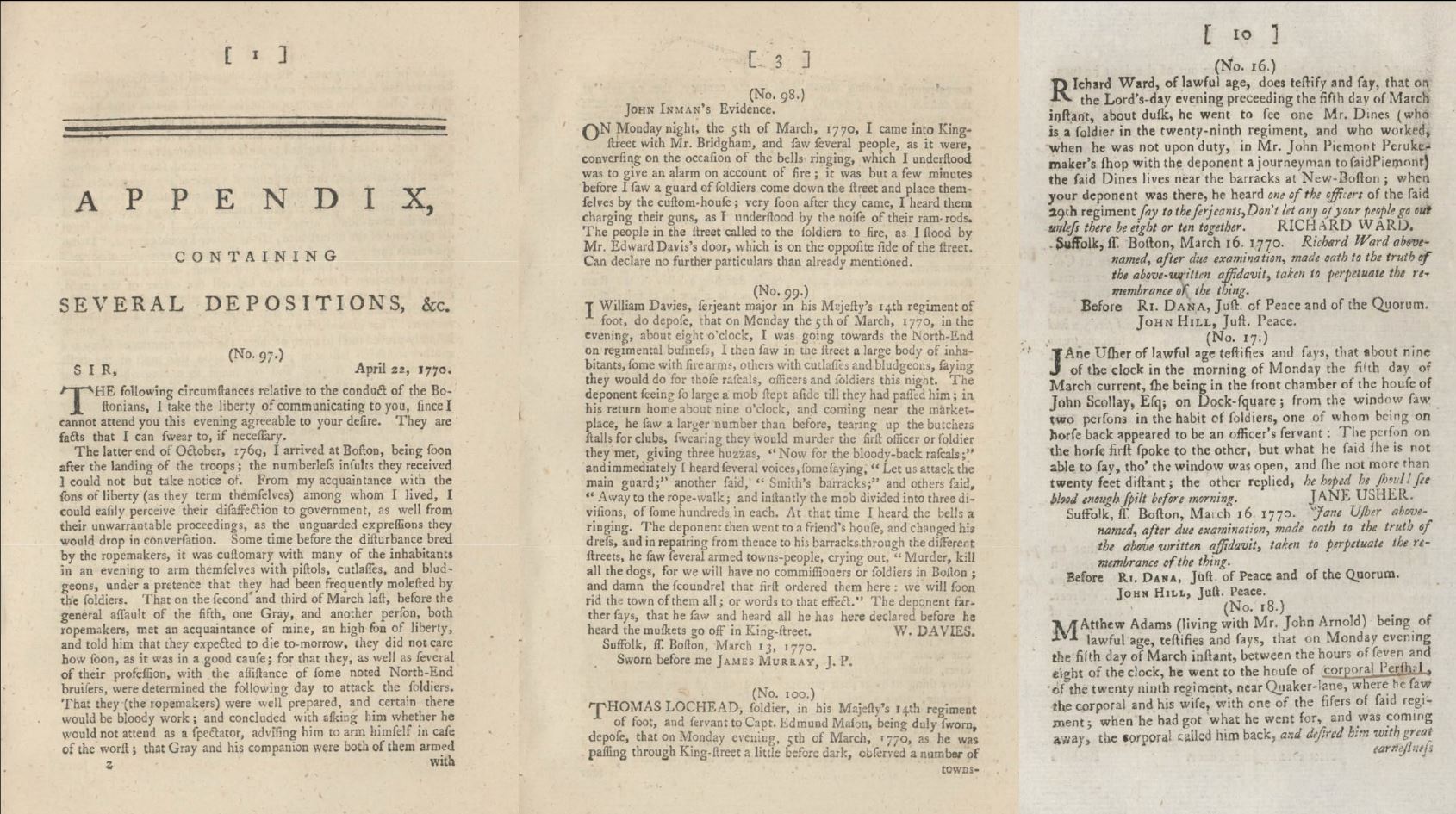 From the very beginning we knew that we wanted the game’s narrative to be as historically accurate as possible, and our main research consisted of looking at depositions of the events leading up to March 5, 1770, and the massacre itself. The depositions were invaluable primary sources, and they acted not only as a solid foundation for our game’s narrative but also as jumping off points for understanding Boston at that moment in time. We looked primarily at two pamphlets printed after the massacre: the “Fair Account of the Late Unhappy Disturbance at Boston”, a pamphlet with military depositions collected by soldiers, and the “Short Narrative of the Horrid Massacre in Boston”, which was created by Boston’s Sons of Liberty. We also looked at depositions from the Adams Papers in order to examine depositions from the actual trial of the soldiers involved in the massacre. We were able to ground a lot of our research when examining sounds by making a spreadsheet of important sounds and dialogues presented by the depositions relating to the massacre. This allowed us to use our initial research to begun crafting a main narrative.